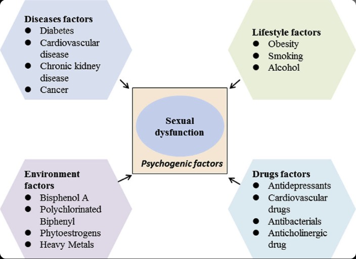 This diagram highlights common factors contributing to sexual dysfunction: