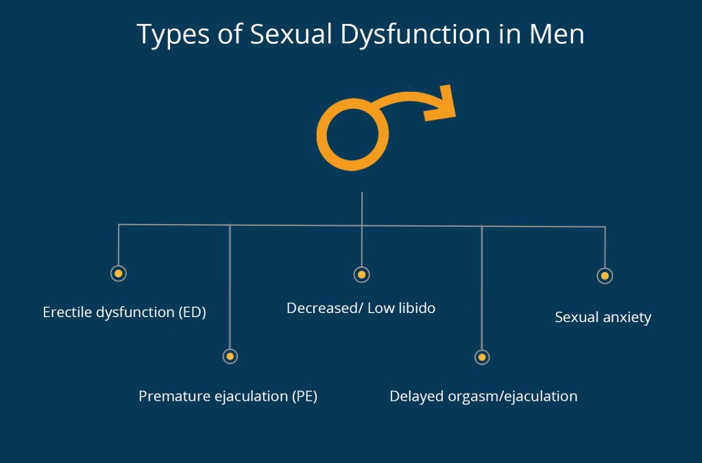 Sexual health and performance disorders in men commonly include erectile dysfunction (ED) (difficulty achieving/maintaining erection), premature ejaculation (PE) (ejaculation sooner than desired), low libido (reduced sexual desire), and other issues like delayed ejaculation or Peyronie’s disease (penile curvature). These conditions are prevalent, often linked to vascular, hormonal, neurological, psychological, or lifestyle factors. They can significantly affect confidence, relationships, and overall well-being. A urologist, andrologist, or sexual health specialist provides thorough evaluation and individualized treatment.